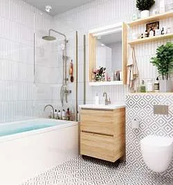 • Визуальное расширение пространства: Белый цвет отражает свет, делая ванную комнату визуально больше и светлее.
