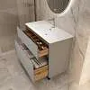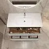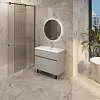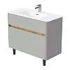 Матовый фасад, интегрированные ручки, керамическая раковина* с широкими бортами для хранения и полки в тон теплому дереву придают интерьеру изящность и подчеркивают уникальный характер. Трендовый серый цвет освежает интерьер, делая его современным и мягким, а тумбу подходящей для большинства интерьеров ванной комнаты.
