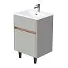 Матовый фасад, интегрированные ручки, керамическая раковина* с широкими бортами для хранения и полки в тон теплому дереву придают интерьеру изящность и подчеркивают уникальный характер. Трендовый серый цвет освежает интерьер, делая его современным и мягким, а тумбу подходящей для большинства интерьеров ванной комнаты.